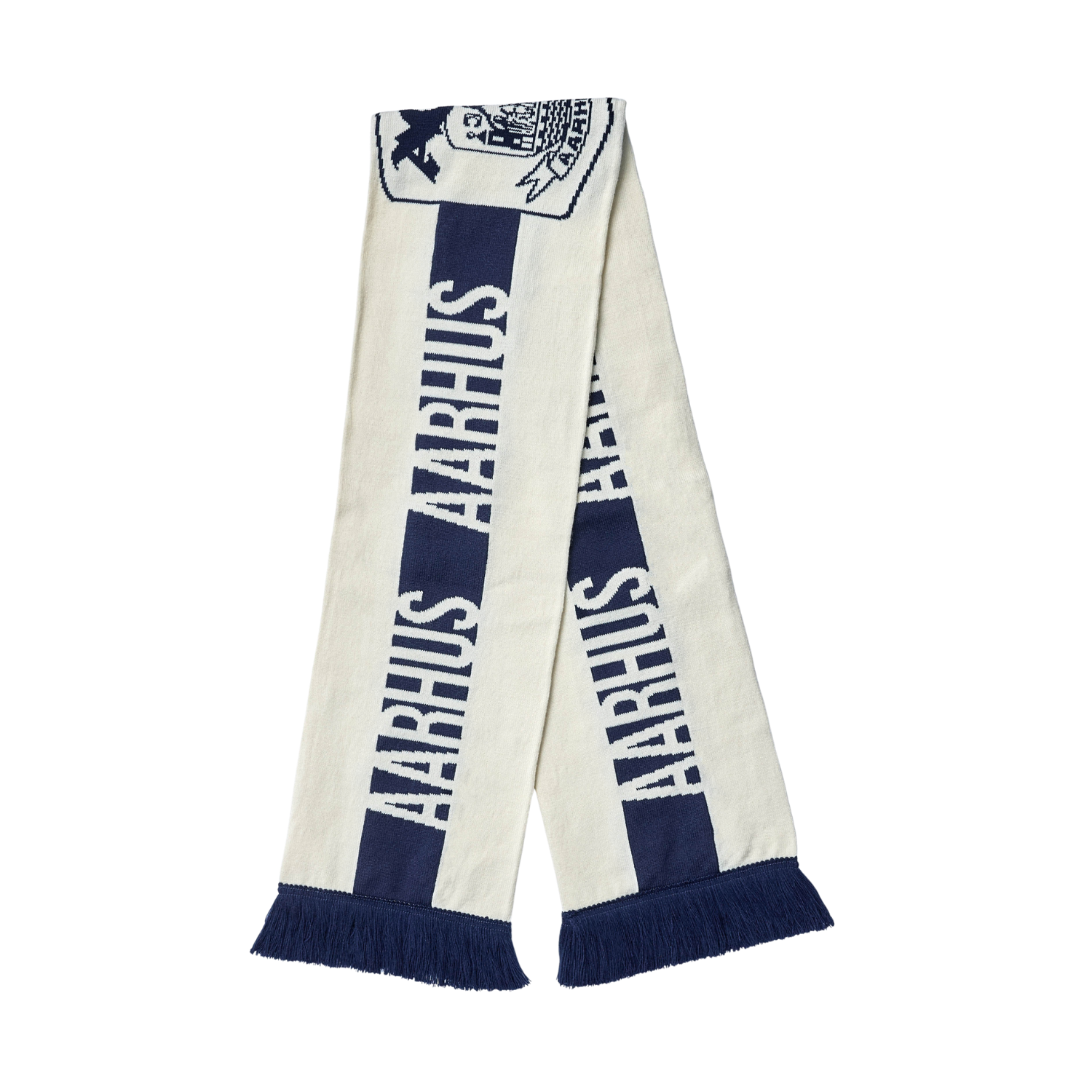 AGF-halstørklæde i blå og beige med AARHUS og våbenskjold. Klassisk design med frynser. Perfekt til kampdag.